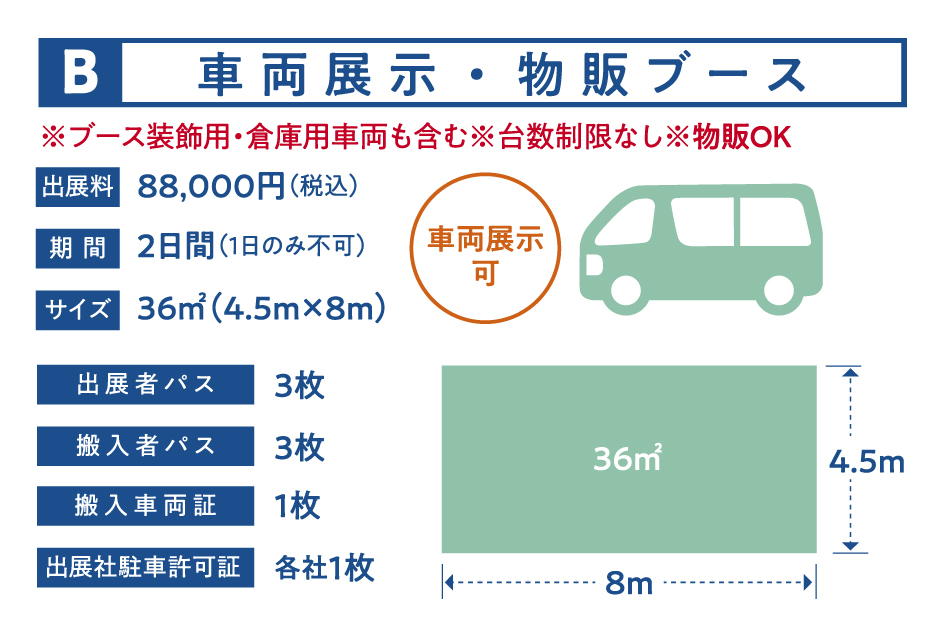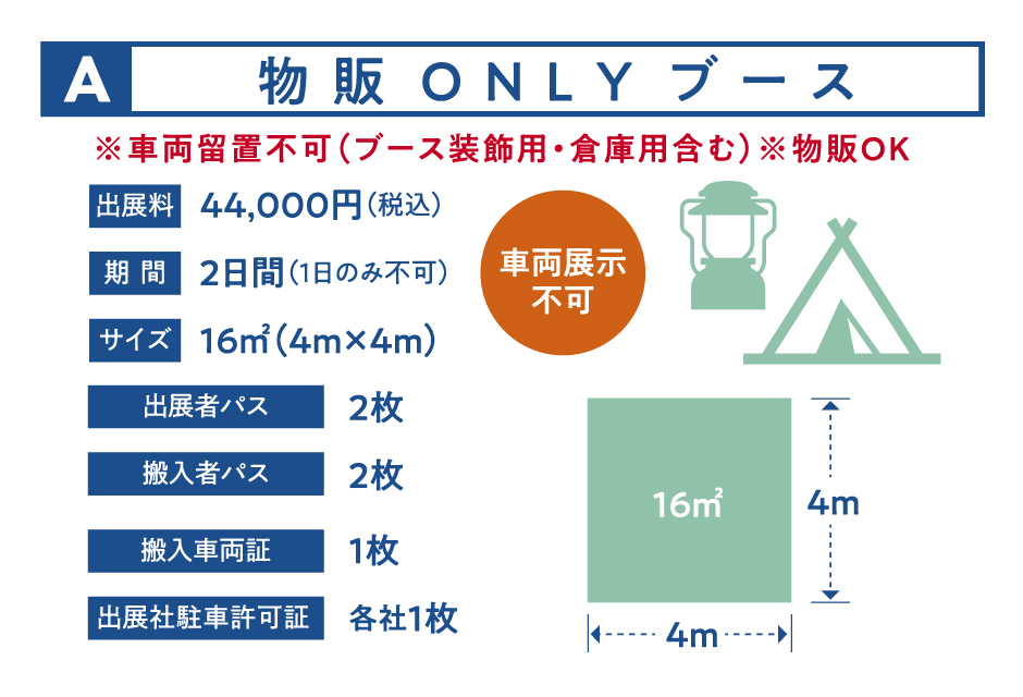 MOTOR CAMP EXPO 2026の出展については、以下より必要事項をご入力の上、お申し込みください。 事務局にて受理後、準備が完了次第、各種登録およびオプション備品をお申込みいただける出展社様用マイページのご案内を差し上げます。 今しばらくお待ちください。 ※販売ブース数に限りがあるため、お申し込みをお断りする場合がございます。予めご了承ください。