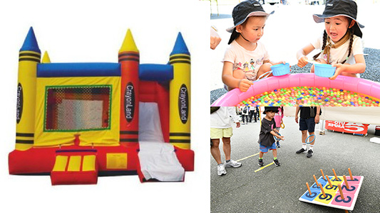 弾んで滑って楽しいふわふわ遊具や上手に輪を入れられたらプレゼントがもらえるわなげ、 1人2個まで持ち帰れるスーパーボールすくいなど、キッズが大好きな遊びが登場します。参加費 ・ふわふわ遊具 1回10分 100円