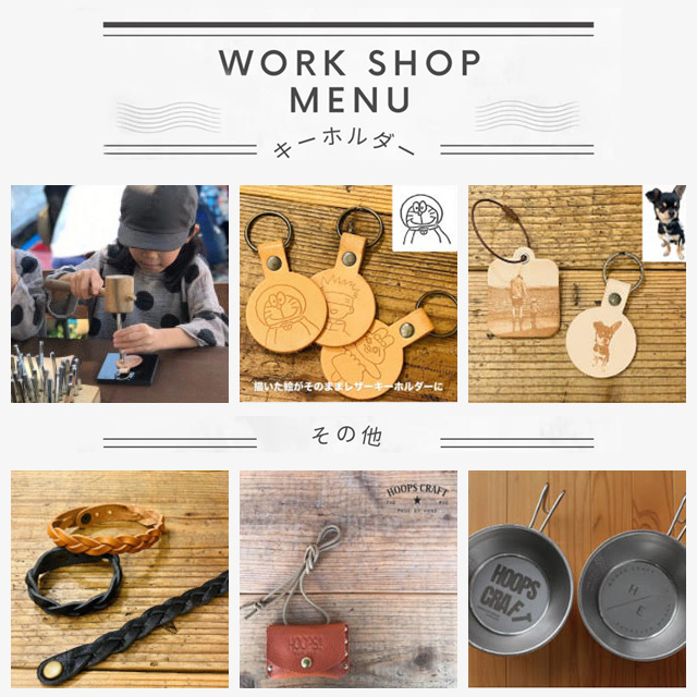 その場で描いた絵やスマホの画像で作るオリジナルレザーキーホルダー、 木槌を使って作るレザーコインケース、 編んで作るレザーブレスレット。 お子様から大人の方も楽しんで体験していただけます。